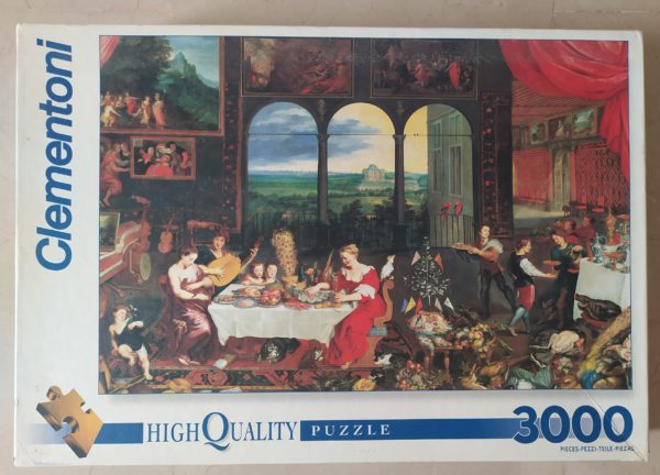 This is a magnificent and extremely rare puzzle by Clementoni. The title is Taste, Hearing and Touch by Jan Brueghel the Elder. You can admire the original painting at the Museo del Prado, in Madrid.