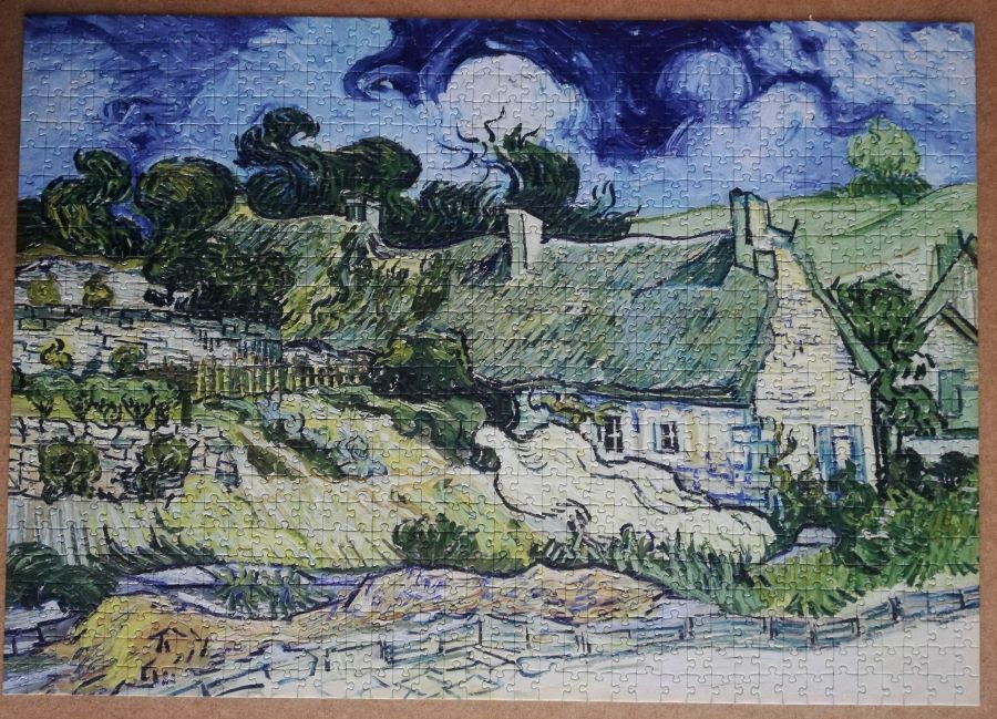 This is a beautiful puzzle by the French brand Bluebird. The title is Thatched Cottages at Cordeville, by Vincent van Gogh. He painted it a few weeks before his tragic death. You can admire the original painting at the Musée d’Orsay, in Paris.