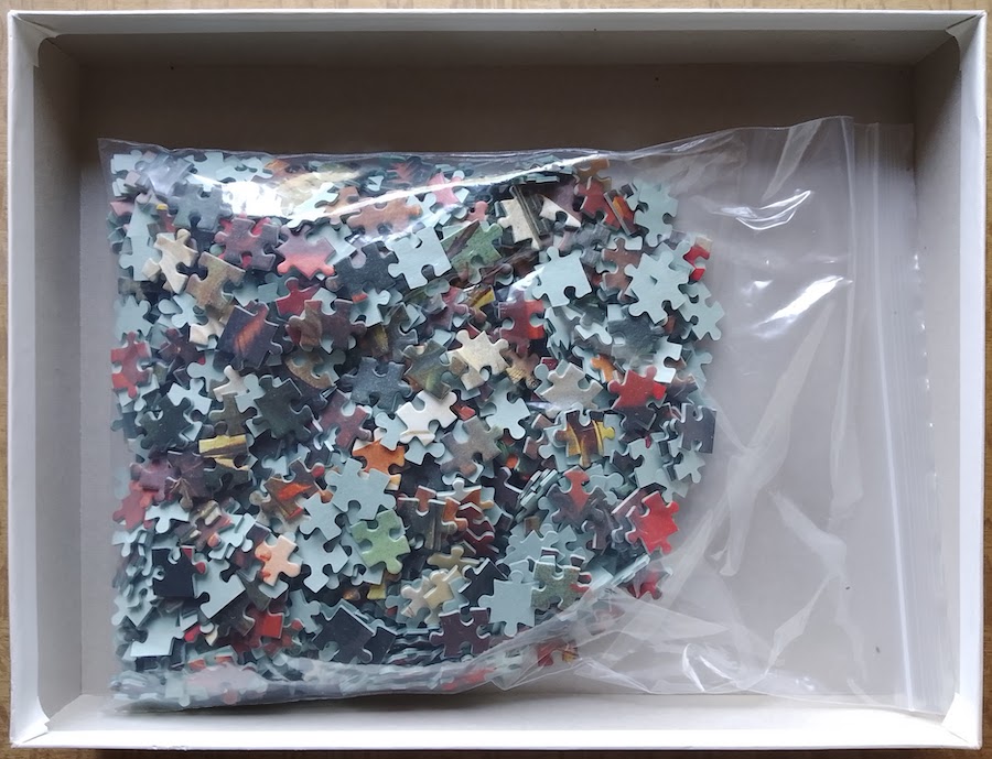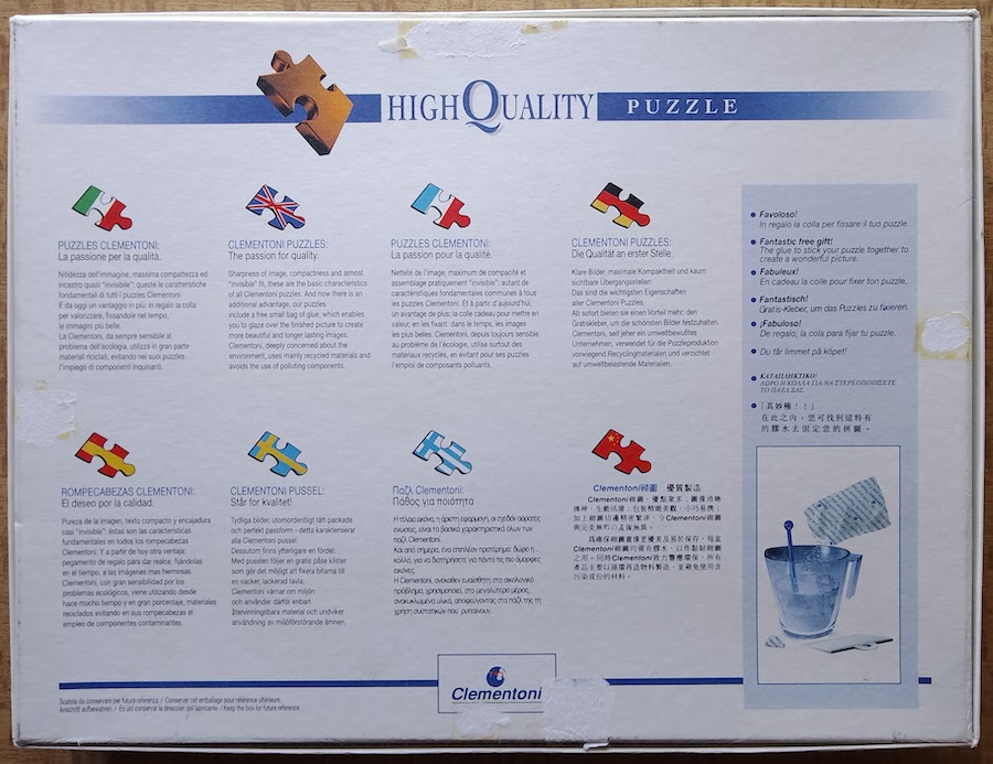 The puzzle is COMPLETE (999 pieces). The pieces are in excellent condition. The box is in very good condition, with some tape tears on the base.