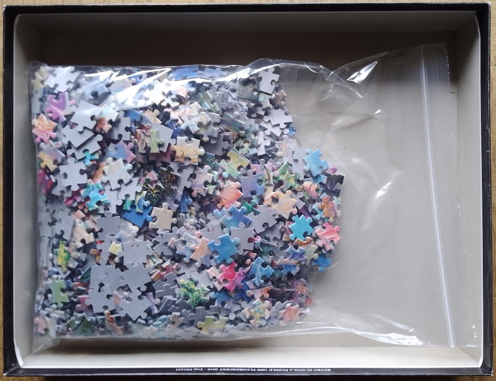 The puzzle is COMPLETE (999 pieces). The pieces are in excellent condition, except for 2 pieces with a knob peeled off, as you can see in the photographs. The box is in very good condition, with some shelf wear.