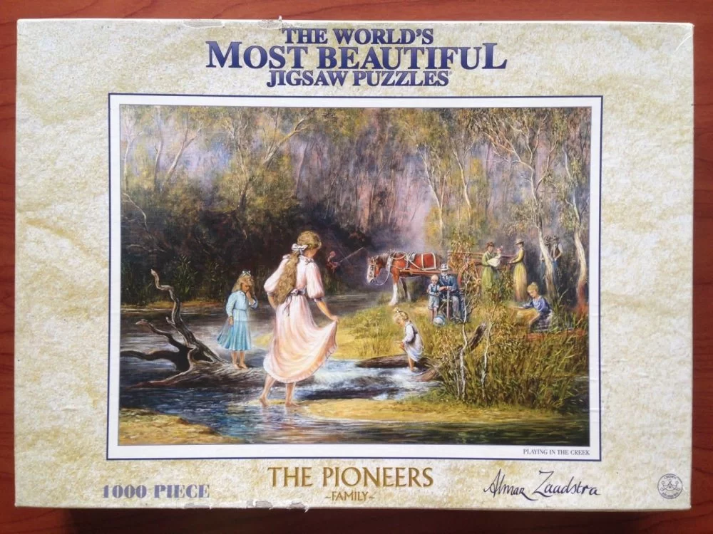 Crown & Andrews published this puzzle in 2004. The title is Playing in the Creek, by the Australian artist Almar Zaadstra. The puzzle belongs to the series The Pioneers: Family. Zaadstra specializes in Australian history and everyday life of the early pioneers.