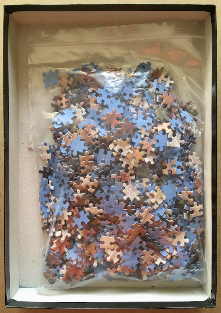 The puzzle is COMPLETE (1000 pieces). The pieces are in excellent condition. The box is in very good condition, except for a tear on the lid and two small tears on the base.