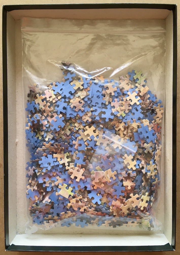 The puzzle is COMPLETE (1000 pieces). The pieces are in excellent condition. The box is in very good condition, with some shelf wear.