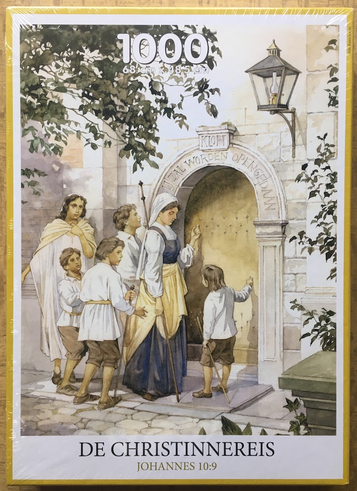 This is an interesting puzzle by the Dutch publisher De Ramshoorn. The title is De Christinnereis, Johannes 10:9, and it is the cover of a book by M.J. Ruissen adapting the Pilgrim’s Progress, by John Bunyan. Although the information doesn’t appear in the box, the illustrator is Rino Visser.