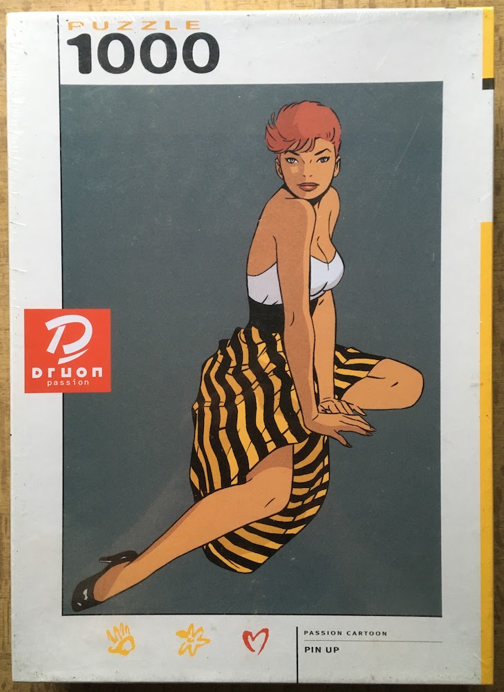 Druon manufactured this puzzle in 2001, as part of their Passion Cartoon collection. The title is Pin Up, by Philippe Berthet.