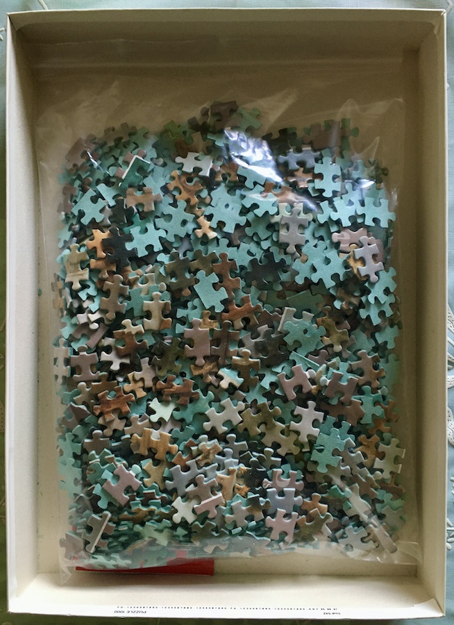 The puzzle is COMPLETE (1000 pieces). The pieces are in excellent condition. The box is in very good condition, with some shelf wear and a couple of tape tears, as you can see in the photographs.