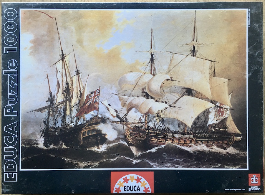 Educa manufactured this puzzle in 2005. The title in the box is simply Sea Battle, and there is no reference to the artist. However, the complete title of the painting is Combat of a Spanish frigate with the English ship Stanhope, by the Spanish artist Ángel Cortellini Sánchez.