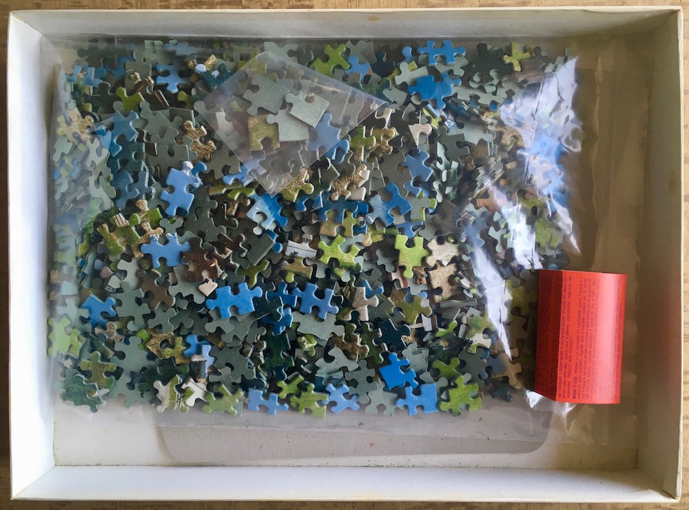 The puzzle is COMPLETE (1000 pieces). The pieces are in excellent condition. The box is in very good condition, with some shelf wear.