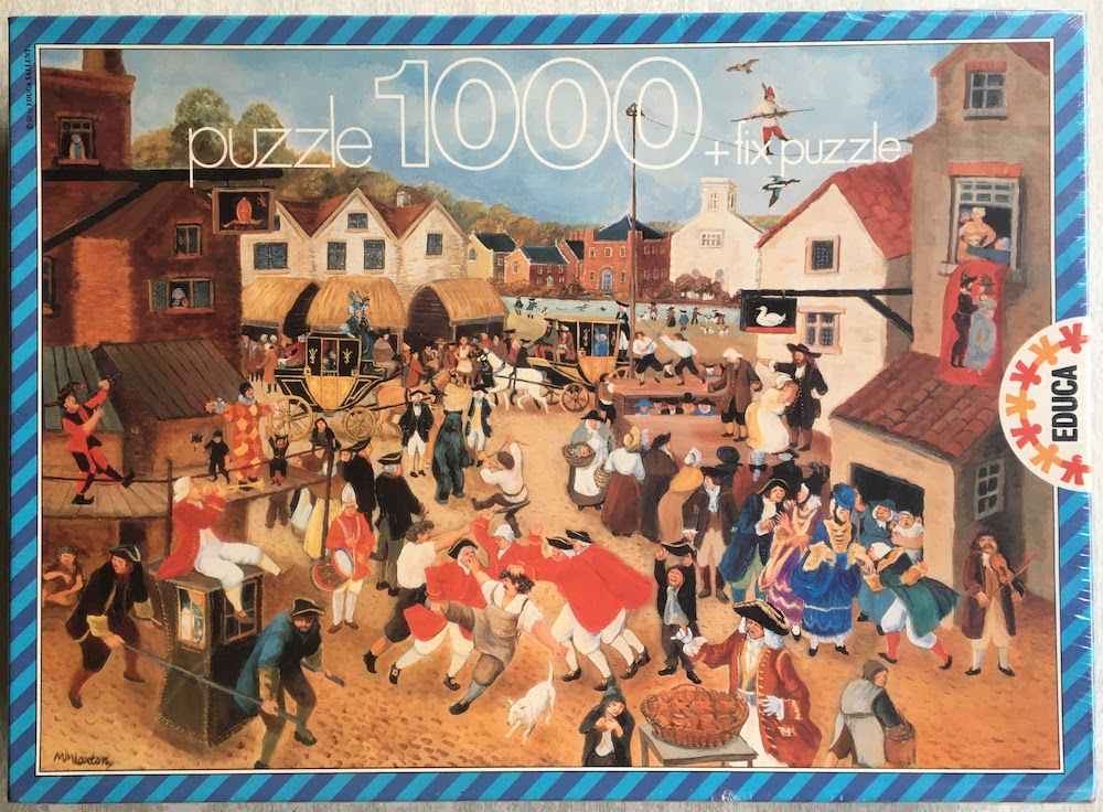 Educa manufactured this rare puzzle in 1992. The title is The Village Fair, by Margaret Loxton.