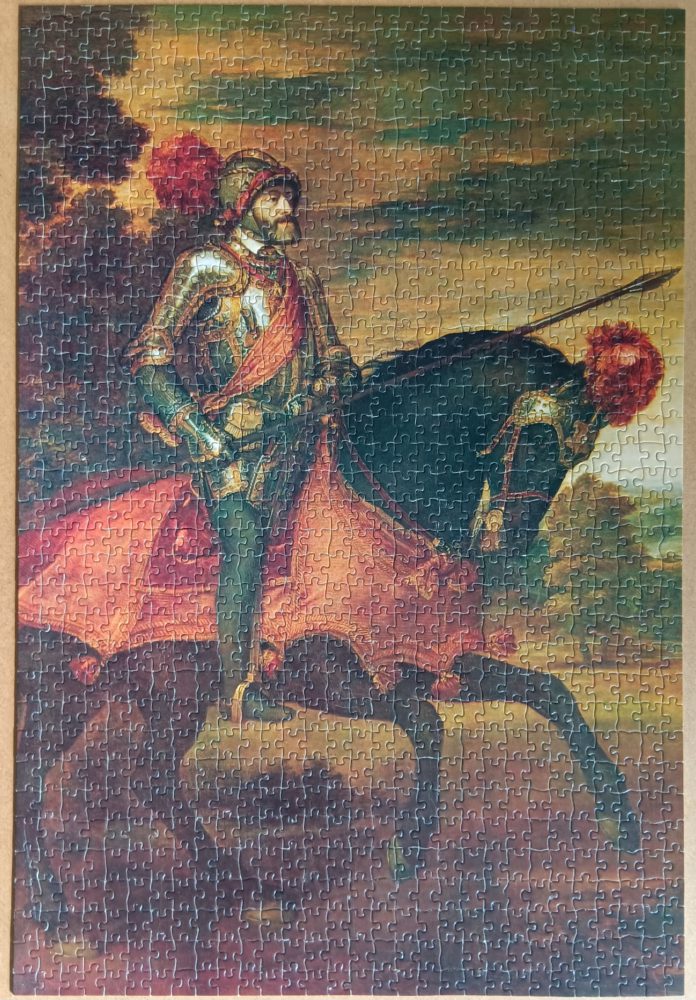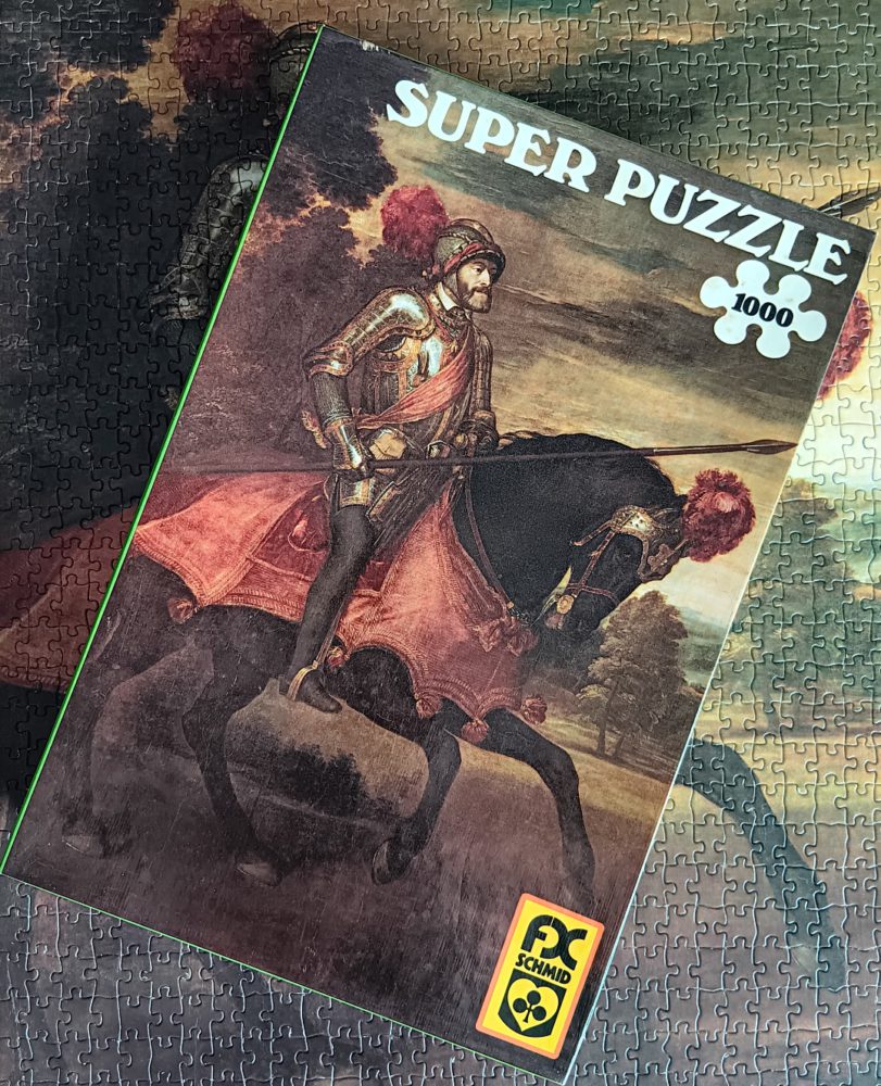This is a beautiful and very rare puzzle by F.X. Schmid. The title is Kaiser Karl V, by the Venetian Renaissance painter Titian. The full title of the original painting in English is Emperor Charles V at the Battle of Muhlberg, and you can admire it in the Prado Museum in Madrid.