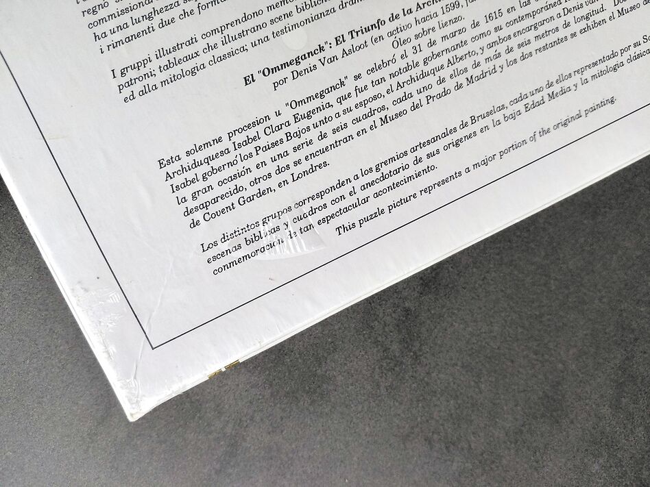 The puzzle is NEW, with its original FACTORY SEAL. The box is in very good condition, but there is a small tear in the seal, as you can see in the photographs, and there are two small depressions near the corners of the lid.