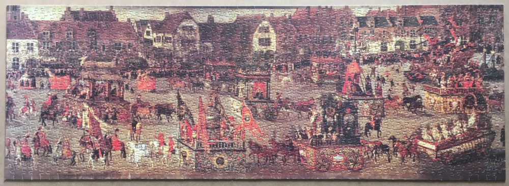This is a panorama puzzle by Falcon. The title is The Triumph of the Archduchess Isabella by Denis Van Alsloot. It is now very difficult to find.