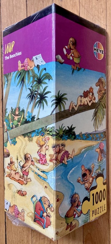 Heye manufactured this puzzle in 2002. The title is The Beachies by French cartoonist Jean-Jacques Loup. It still appears sometimes, but it is becoming very rare in new condition.