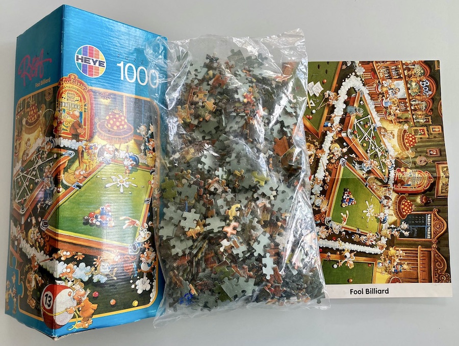 Heye manufactured this rare puzzle in 1994. The title is Fool Billiard, by German cartoonist Michael Ryba. Like most old Heye puzzles, it is now difficult to find, especially in new condition.