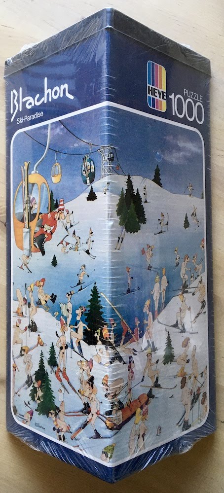 Heye manufactured this puzzle in 1979. The title is Ski Paradise, by Roger Blachon. It is very difficult to find now.