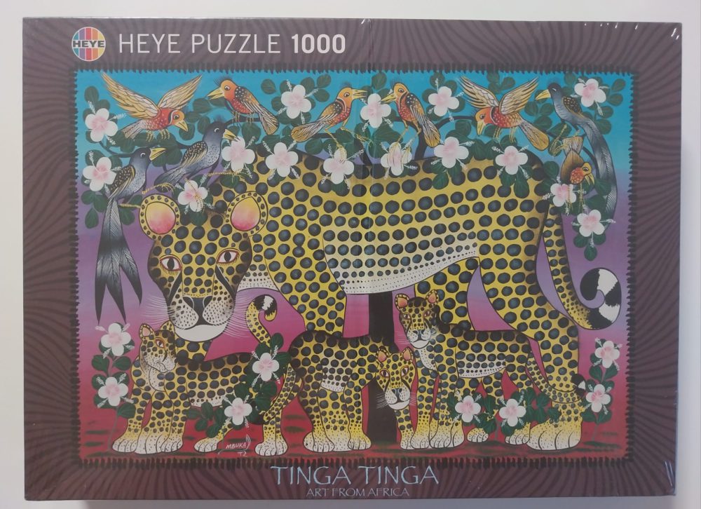 Heye manufactured this jigsaw puzzle in 2011 as part of their puzzle series Tinga Tinga! The title is Wildcat Family, by Abbasy Mbuka. It represents the unique and authentic African art style.