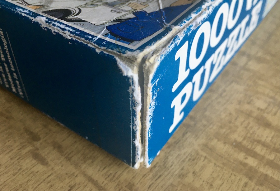 The puzzle is COMPLETE (1008 pieces). The pieces are in excellent condition, except for a piece with some minor damage. The top layer peeled off, as it happens sometimes, and they glued it back slightly off, as you can see in the photograph. It will not be very noticeable when the puzzle is assembled. The box is in good condition, with some wear, tape tears, and a tear on a corner.