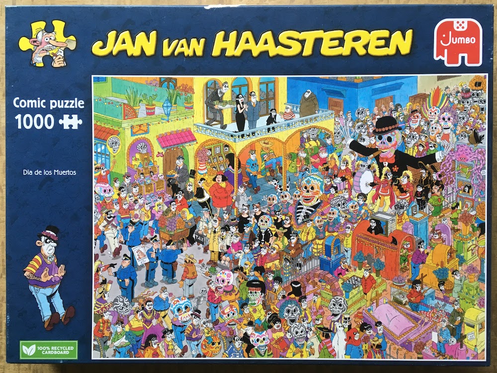 Jumbo published this puzzle in 2022. The title is Día de los Muertos, or Day of the Dead, by Jan van Haasteren. The Day of the Dead is a holiday tradition from Mexico.