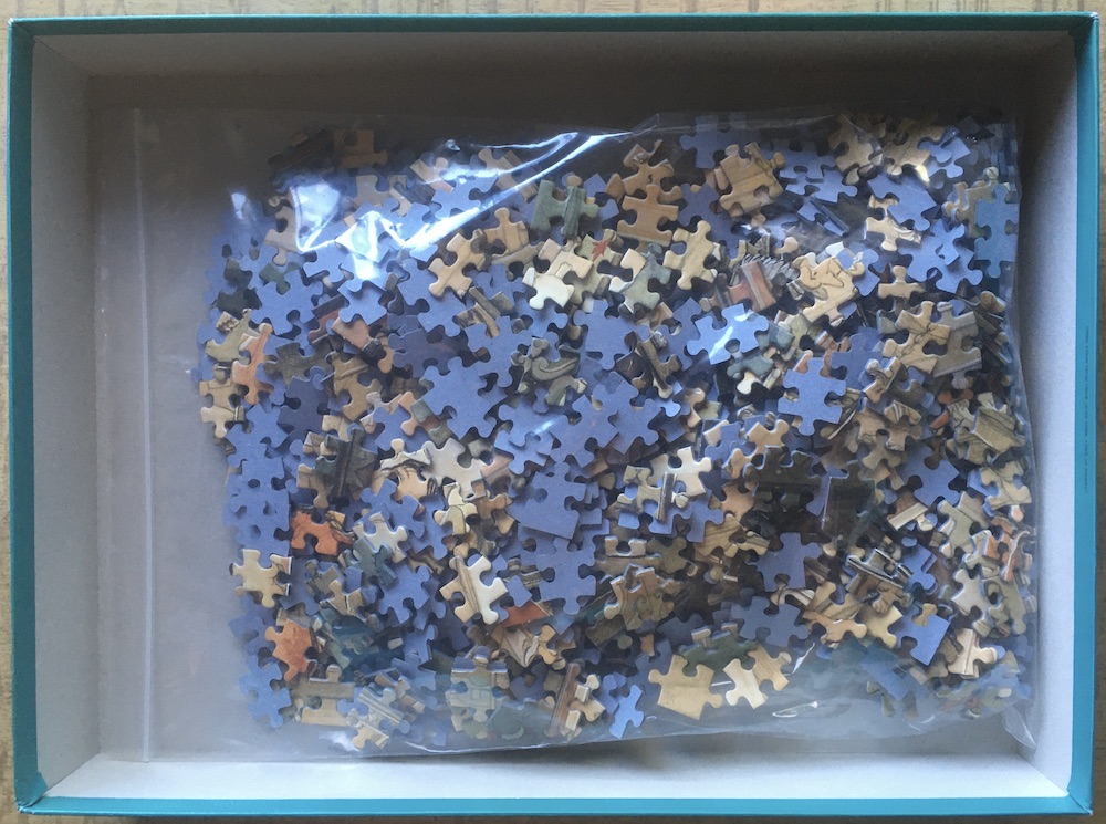 The puzzle is COMPLETE (1000 pieces). The pieces are in excellent condition. The box is in very good condition, with some writing inside the box.