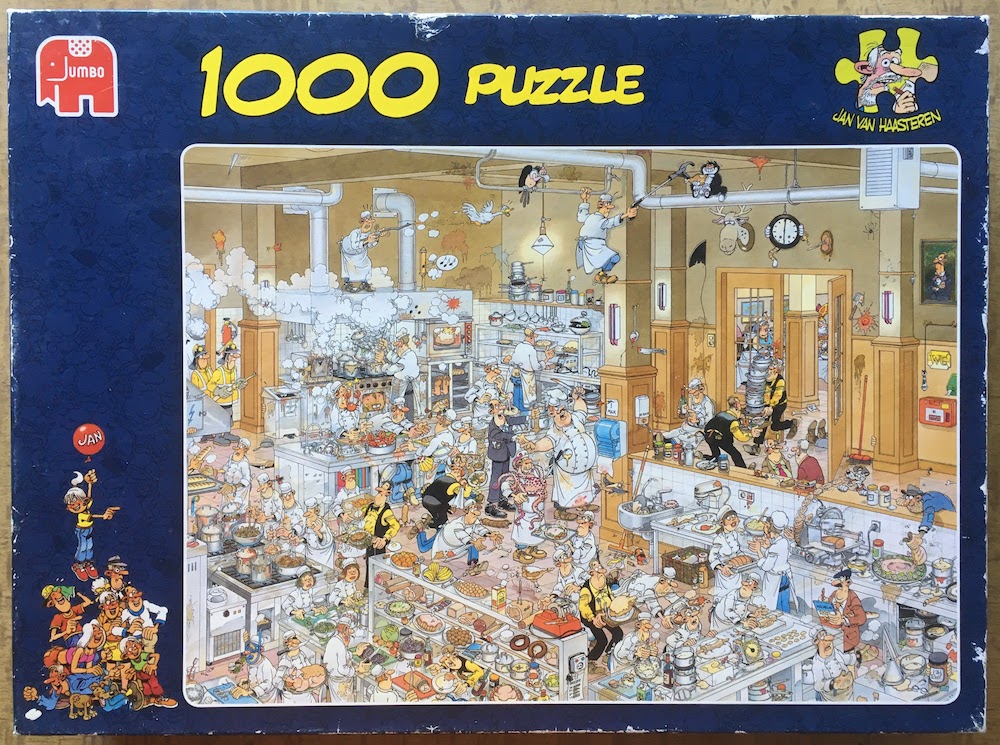 Jumbo manufactured this interesting cartoon puzzle in 2009. The title is The Kitchen, by Jan van Haasteren.