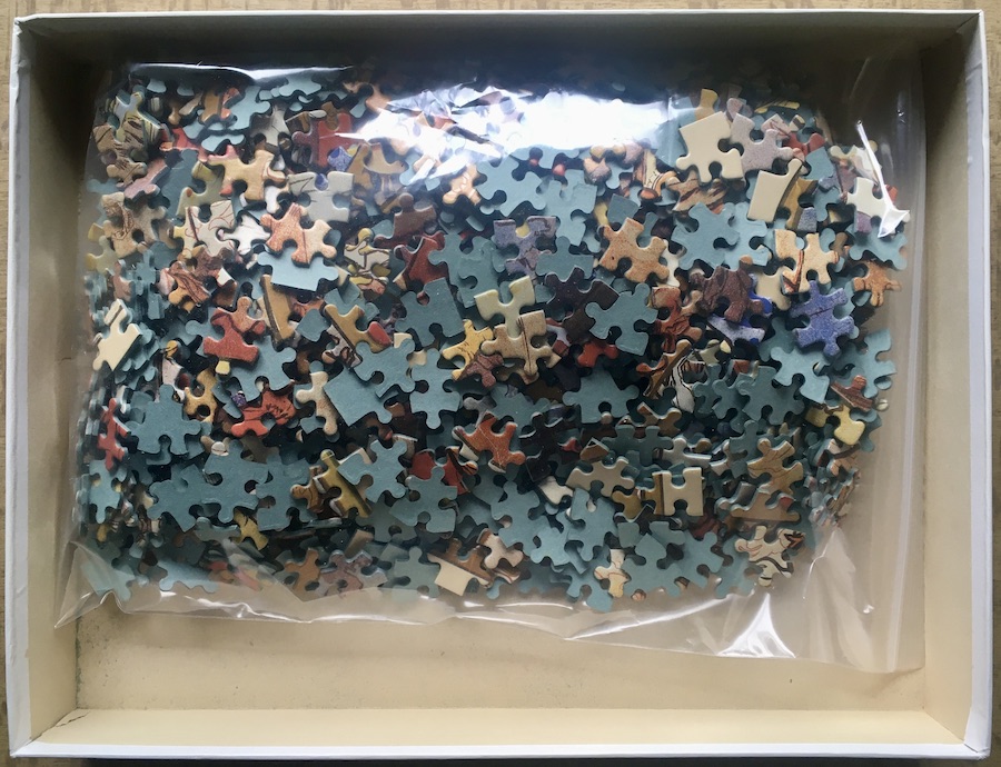 The puzzle is COMPLETE (1008 pieces). The pieces are in excellent condition. The box is in very good condition, with a some shelf wear, and a small tape tear on a corner of the lid.