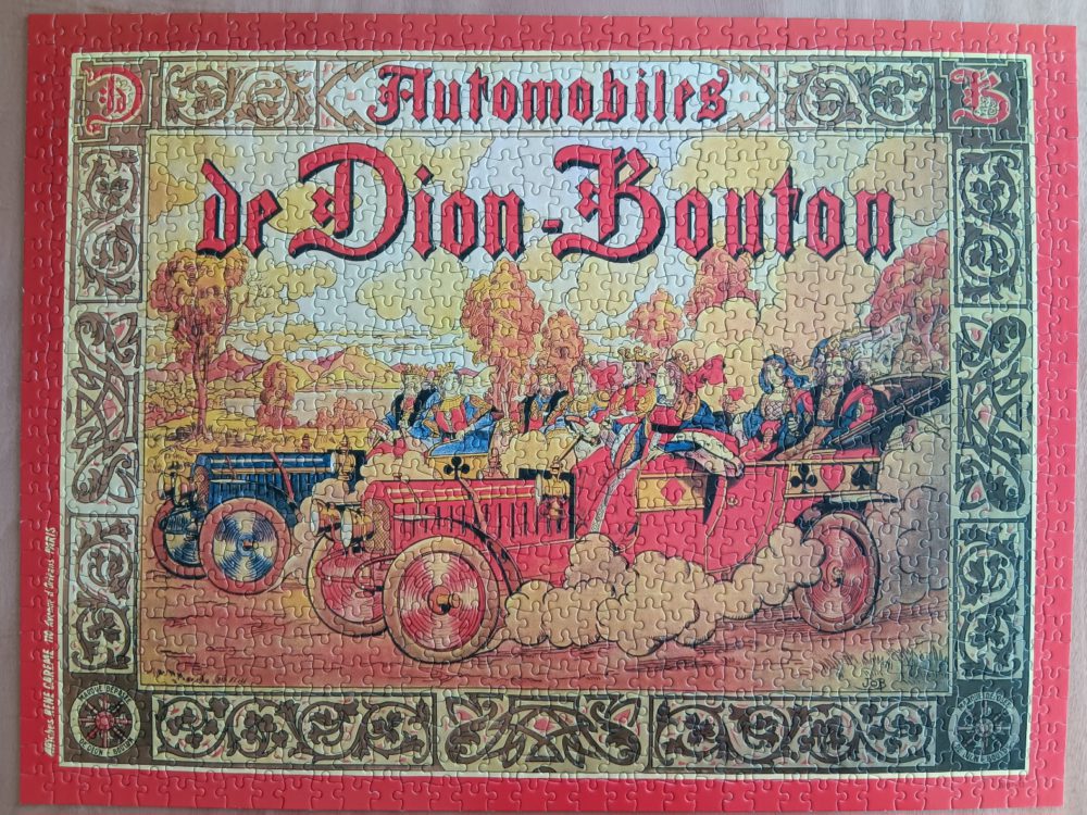 MB published this rare and beautiful puzzle in 1984. The title is Automobiles de Dion-Bouton, and it depicts a poster for the early French De Dion-Bouton car brand. The poster was designed by the illustrator Jacques Marie Gaston Onfroy de Bréville, who is known by the penname JOB after his initials.