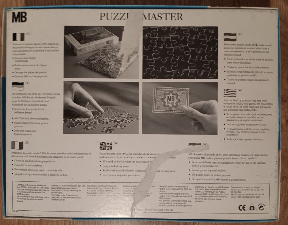 The puzzle is COMPLETE, as you can see in the image of the assembled puzzle. The pieces are in excellent condition. The box is in very good condition, although there are tape tears on the back of the base, as the photographs show.