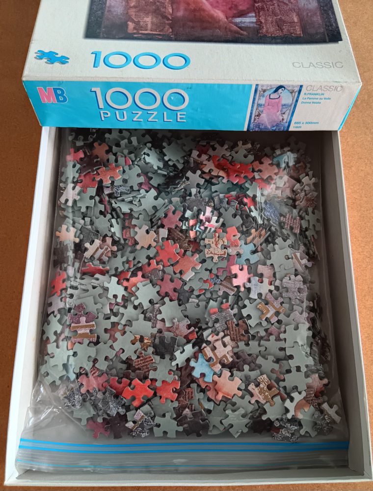 MB manufactured this rare puzzle in 1994. The title is Donna Velata, by Richard Franklin.