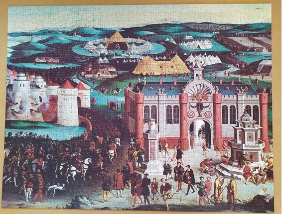 MB produced this very rare puzzle in 1974 as part of their Prado series. The title in the box is The Field of the Cloth of Gold, by Friedrich August Bouterwek. However, the complete title of the painting is Meeting at the Field of the Cloth of Gold, 7th June 1520.