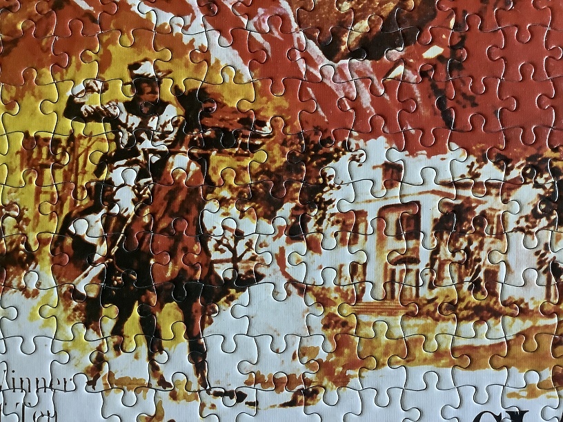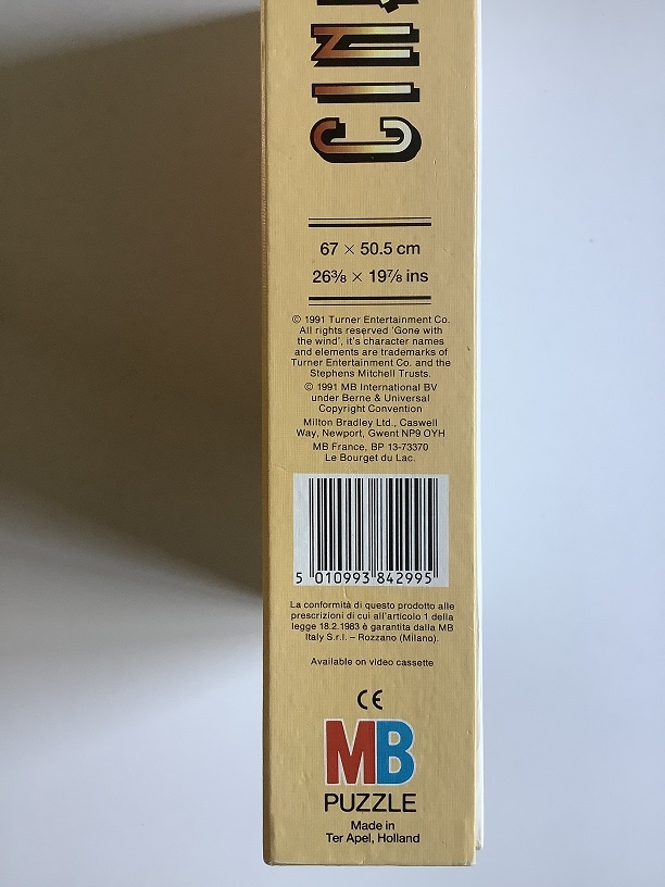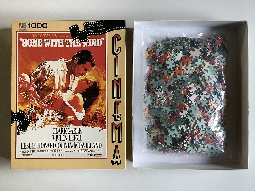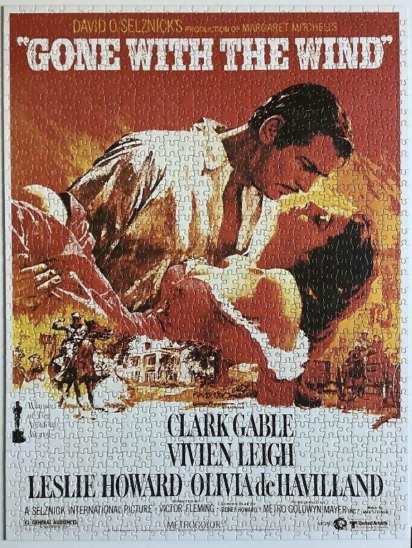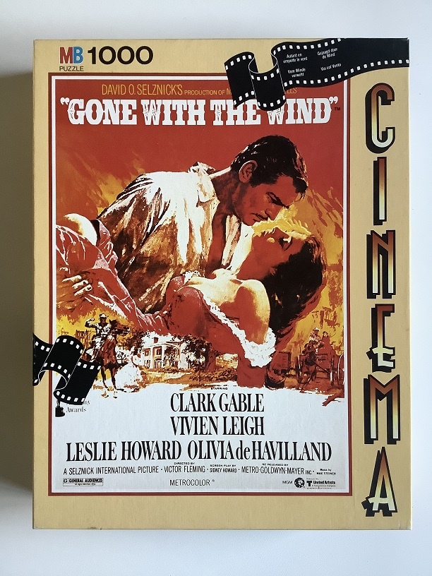 MB manufactured this puzzle in 1991. The title is Gone with the Wind, and it represents the poster with which the movie was originally released.