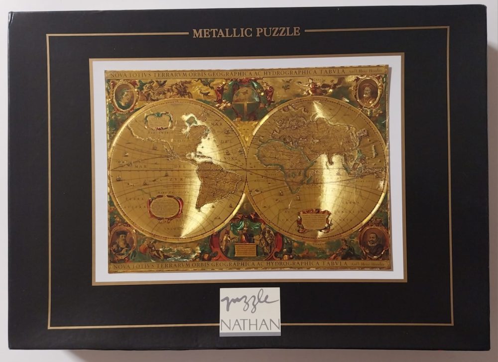 Nathan manufactured this puzzle in 1994 as part of their Metallic Puzzle collection. The title is Aqua et Terra. It is really a version of the Nova Totius Terrarum Orbis Geographica Ac Hydrographica Tabula, by Henricus Hondius the Younger.