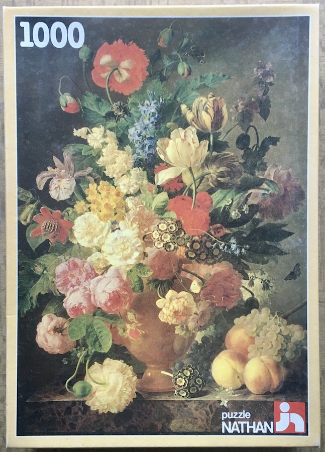 Nathan manufactured this puzzle in 1985. The title on the box is Bouquet, by Jan Frans van Dael. You can admire the original painting at the Louvre Museum.