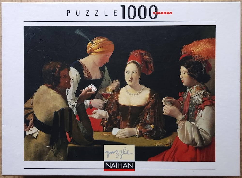 This is a very interesting and rare puzzle by Nathan. The title is The Cheat with the Ace of Diamonds, or Le Tricheur à l’As de Carreau, by George de la Tour.