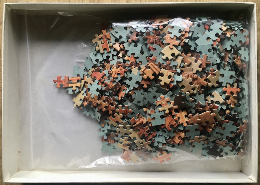 Nathan published this extraordinary puzzle in 1985. The title on the box is The Encounter. The real title of the painting, however, is Meeting of the Betrothed Couple and the Departure of the Pilgrims, by Vittore Carpaccio. It’s the largest painting of the series The Legend from the life of Saint Ursula. You can admire the original painting in the Gallerie dell’Accademia, in Venice.