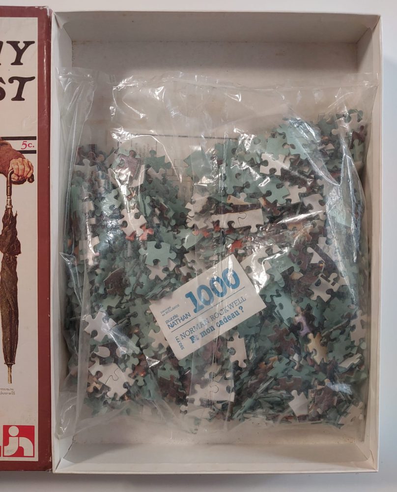Nathan manufactured this puzzle in 1985. The French title on the box is Et Mon Cadeau?, by Norman Rockwell. It is the cover of The Saturday Everning Post corresponding to January 25, 1936. The original title of the artwork is The Gift (Little Boy Reaching in Grandfather’s Overcoat).