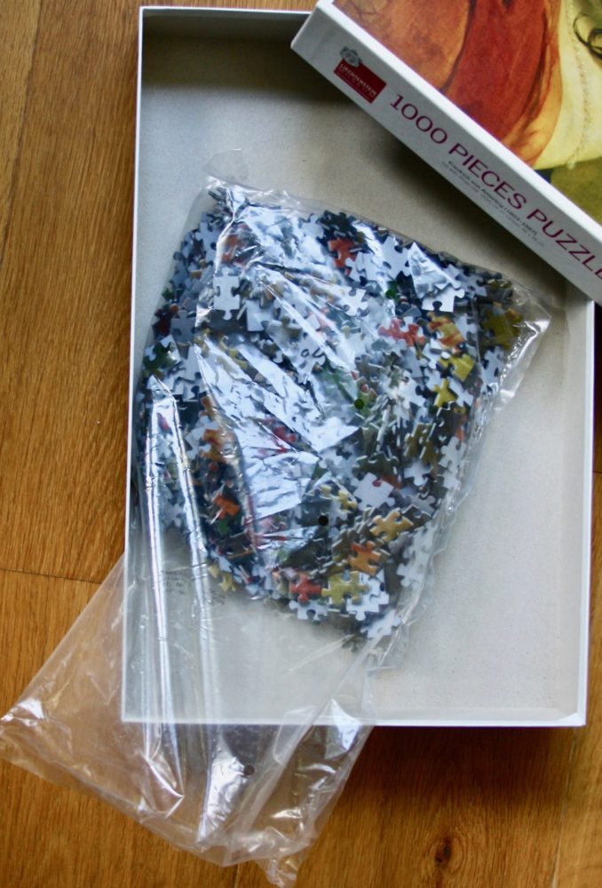 The puzzle is like NEW, with all the pieces SEALED inside the original plastic bag. The box is in very good condition, with just a small dent in the lid.