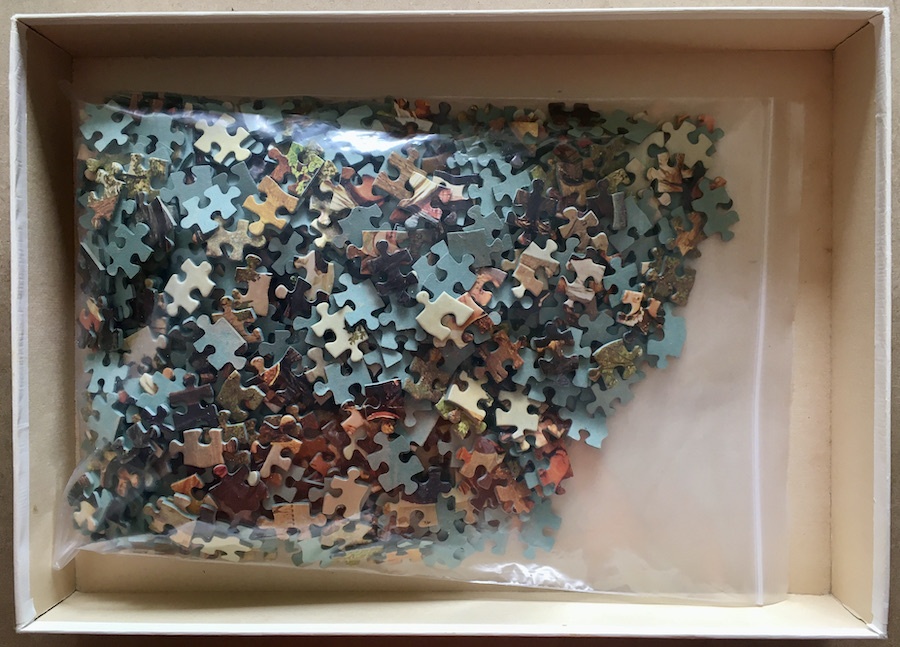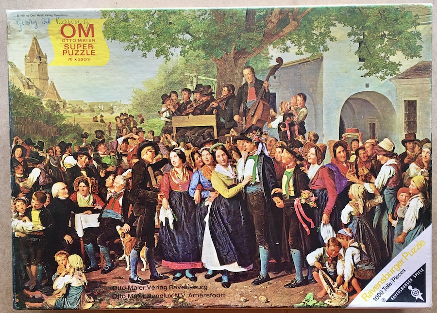 Ravensburger manufactured this puzzle in 1971, so it is 50 years old already. The title in the box is Biedermeier Scene, by Ferdinand Georg Waldmüller. The real title of the painting is Lower Austrian Country Wedding, and you can admire the original painting at the Belvedere Museum, in Vienna.