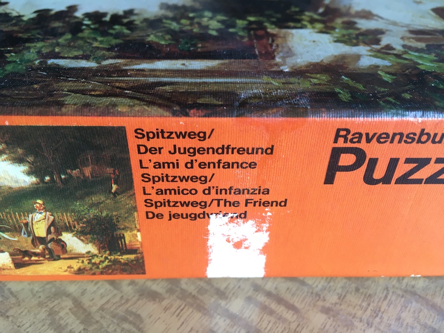 Ravensburger manufactured this beautiful puzzle in 1979. The title is The Childhood Friend, by Carl Spitzweg.