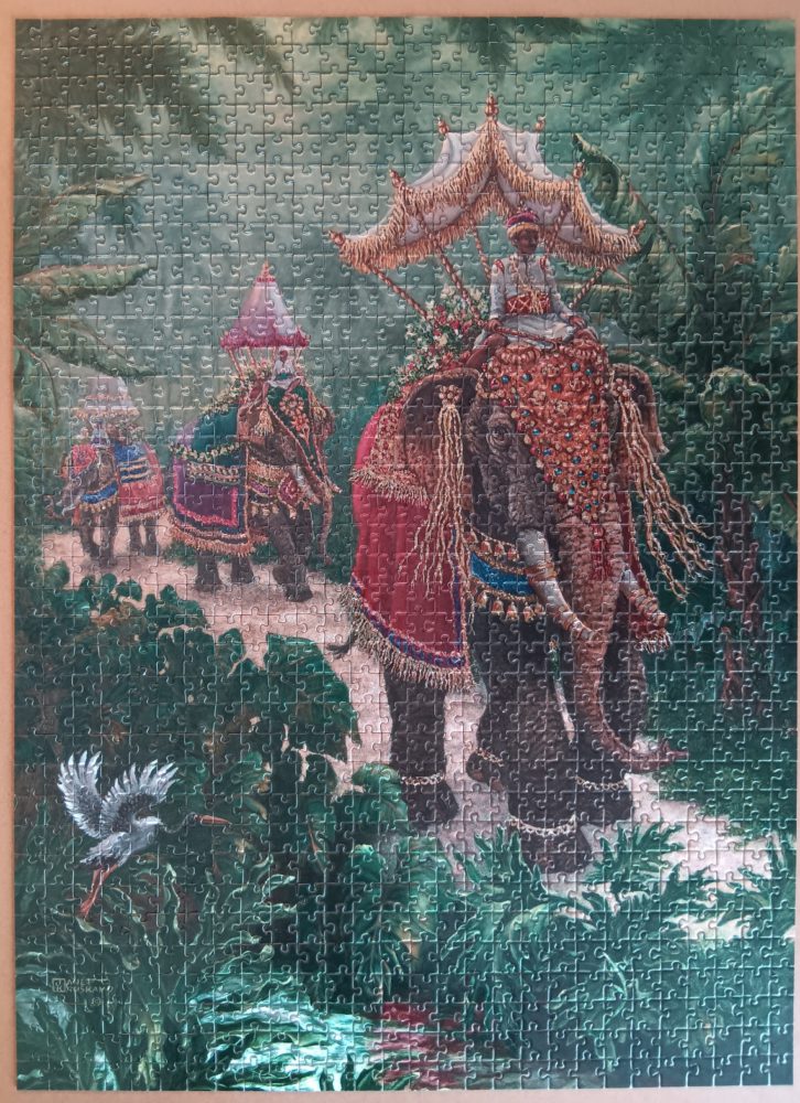 In 2002 Ravensburger published this puzzle in their Collection Exclusiv. The title is Festival Bound by Janet Kruskamp. The pieces have a shiny metallic finish, giving the puzzle a magnificent look.