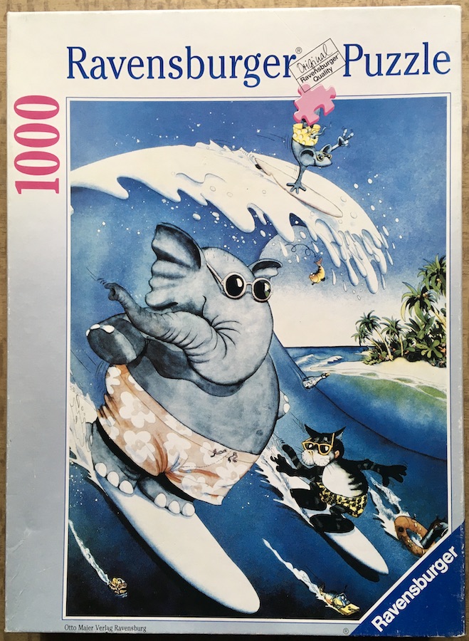 Ravensburger published this funny puzzle in 1991. The title in the box is Surfer, although the real title of the illustration is The Big Surf, by Alex Rinesch.