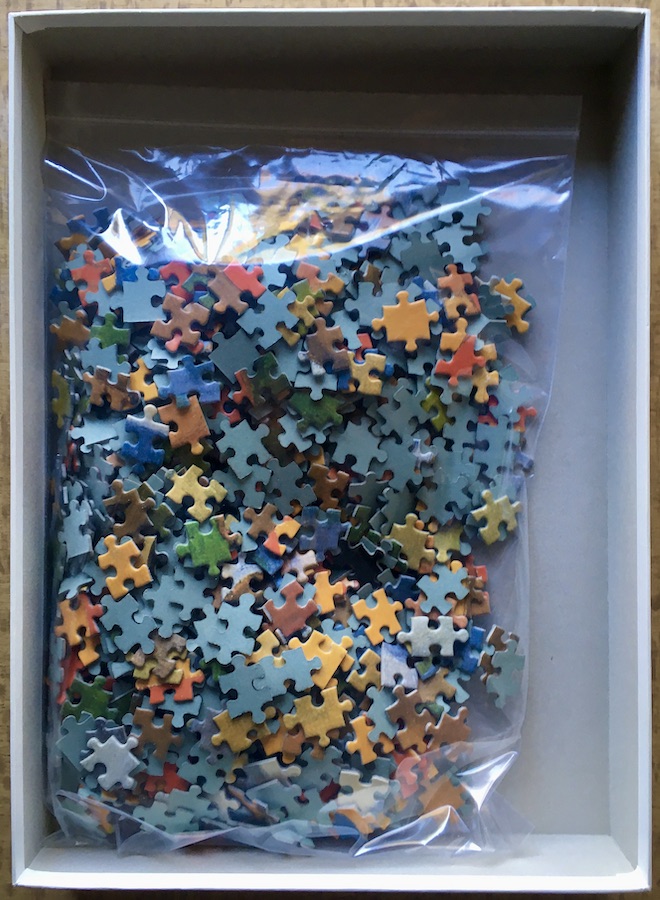 Ravensburger manufactured this puzzle in 1992. The title on the box is Two Women, although the real title of the painting is Nafea Faa Ipoipo, which means “When will you marry?” in Tahitian. The artist is Paul Gauguin.