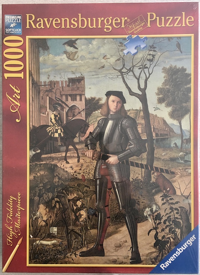 Ravensburger manufactured this puzzle in 2015. The title is Young Knight in a Landscape, by Vittore Carpaccio. You can admire the original painting at the Thyssen-Bornemisza National Museum, in Madrid.