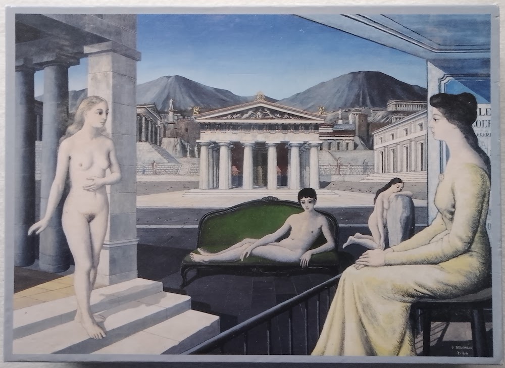 This is a very rare puzzle that Ronin manufactured for the Paul Delvaux Fountaion. The title is Le Canapé Vert, by Paul Delvaux.