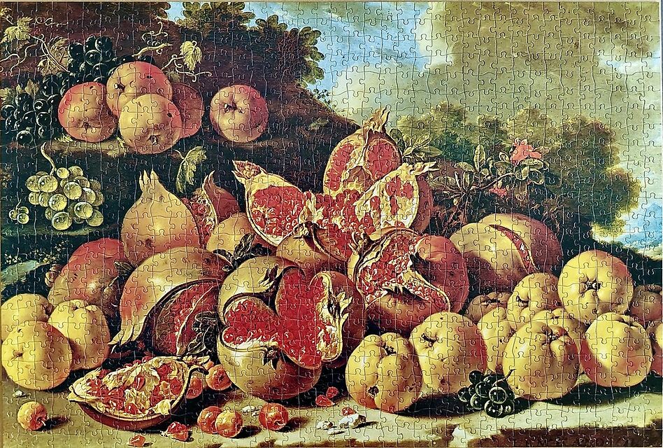 Schmidt manufactured this beautiful puzzle probably in the late 70s or early 80’s, for their Fine Art series. It is very rare and hard to find nowadays. The title on the box is Stilleben, or Still Life, with Menendez as the name of the artist. The original painting however, is by Luis Egidio Meléndez, and it is called Still Life with Pomegranates, Apples, Haw Berries and Grapes in a Landscape. You can admire the original artwork in the Museo del Prado in Madrid.