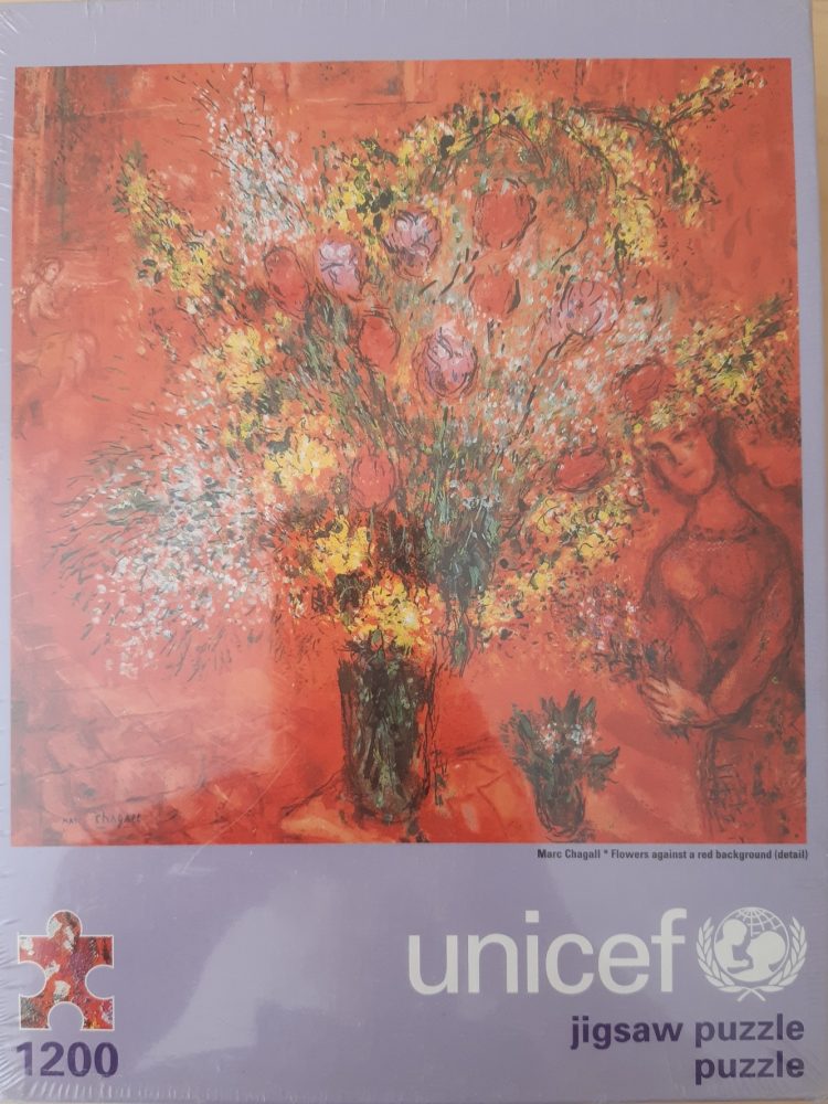 This is a very nice puzzle by Unicef. The title is Flowers against a Red Background, by Marc Chagall.