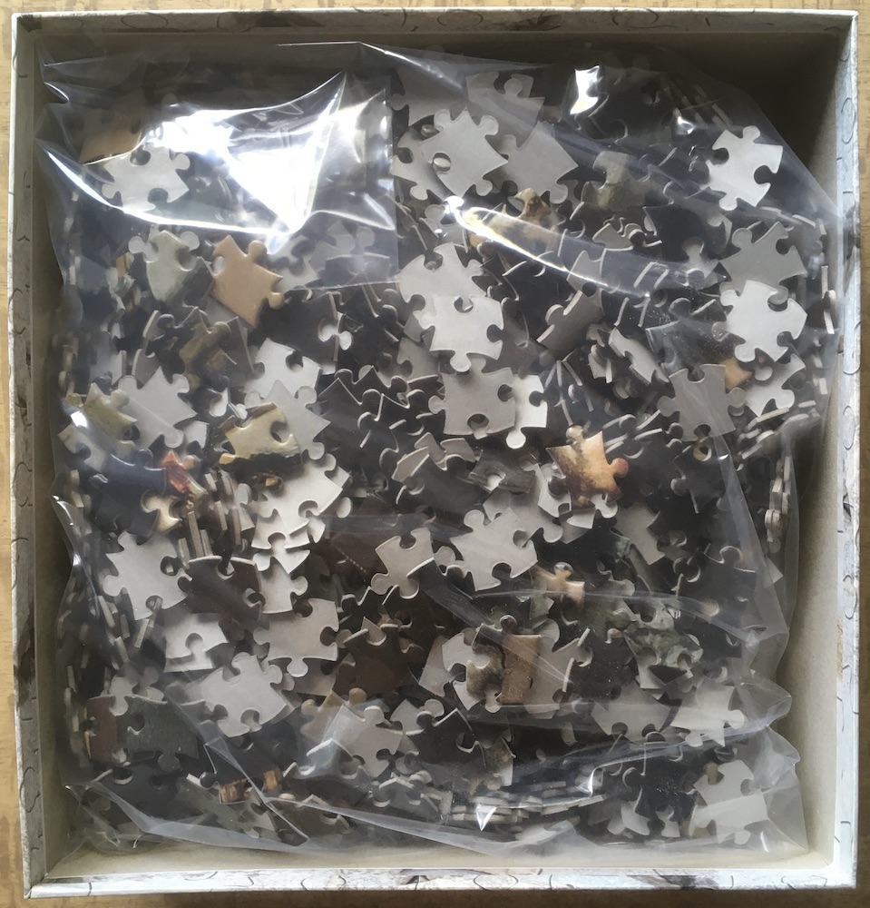 The puzzle had the pieces in a sealed bag, but there were two small cuts in the bag, large enough for the pieces to come out, so I opened it and verified it, just in case. The puzzle is COMPLETE (1500 pieces). The pieces are in like new condition. The box is in good condition, with some shelf wear.