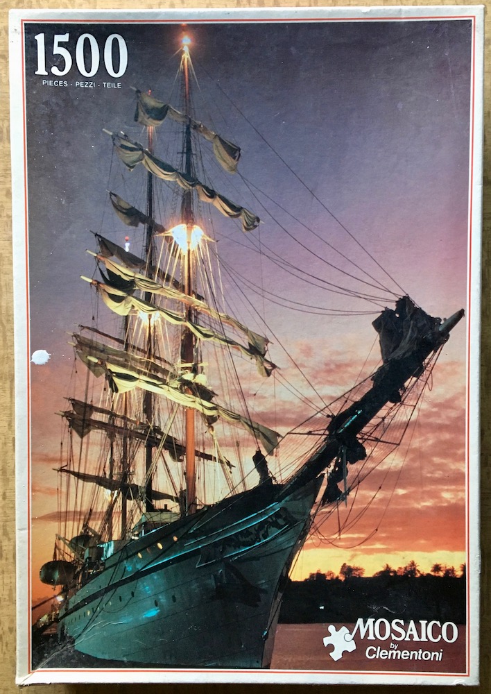 This is an old puzzle by Clementoni. The title is Sailing Ship, and it is a beautiful photograph at dusk. The name of the collection is Mosaico.
