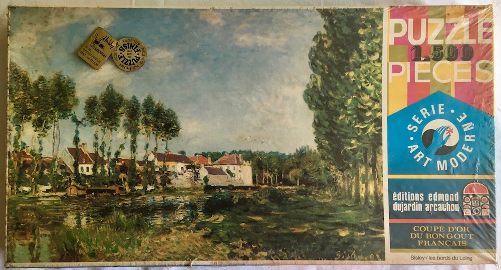 This is a very old puzzle by Dujardin. Although there is no date in the box, the name of the manufacturer was still Éditions Edmond Dujardin Arcachon. The title is The Banks of the Loing at Moret, by Alfred Sisley.
