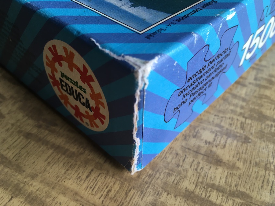 The puzzle is like NEW, with all the pieces SEALED inside the original plastic bag. The box is in very good condition, with some shelf wear, a tear on a corner of the lid, and a couple of tape remnants on the base.