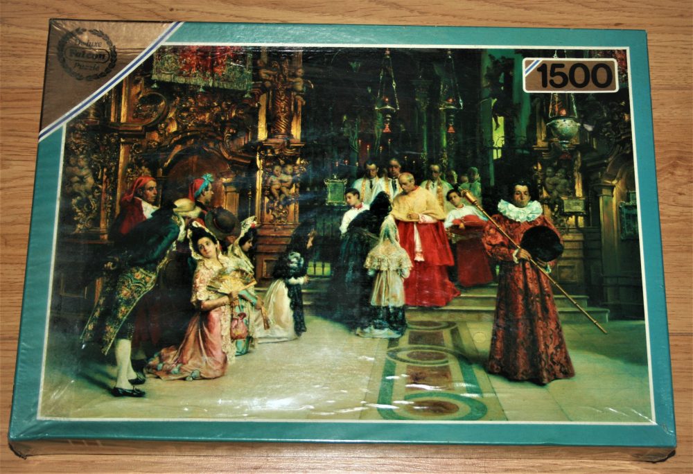 Falcon publish this fabulous puzzle in 1992. The title is A Blessing from his Eminence, by the Spanish artist Salvador Viniegra y Lasso de la Vega. It is very rare and extremely difficult to locate.